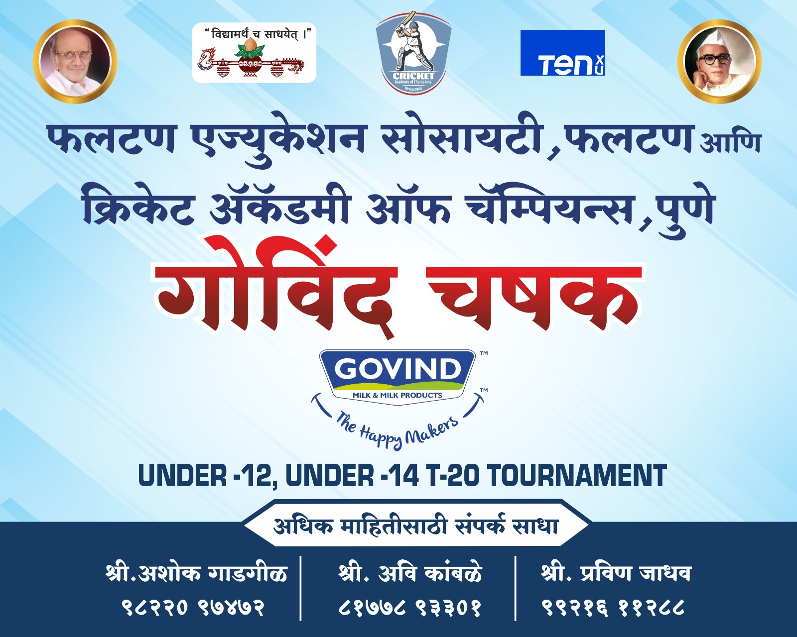 महाराष्ट्र माझा न्यूज नेटवर्क फलटण प्रतिनिधी :-फलटण एज्युकेशन सोसायटी आणि क्रिकेट अकॅडमी ऑफ चॅम्पियन्स यांच्या संयुक्त विद्यमाने “गोविंद चषक” अंतर्गत १२ वर्षांखालील (U-12) व १४ वर्षांखालील (U-14) गटांसाठी लेदर बॉल क्रिकेट स्पर्धेचे आयोजन करण्यात आले आहे. ही स्पर्धा दि. ३ मे ते २० मे २०२६ या कालावधीत श्रीमंत शिवाजीराजे क्रीडा संकुल, शिंगणापूर रोड, फलटण येथे…