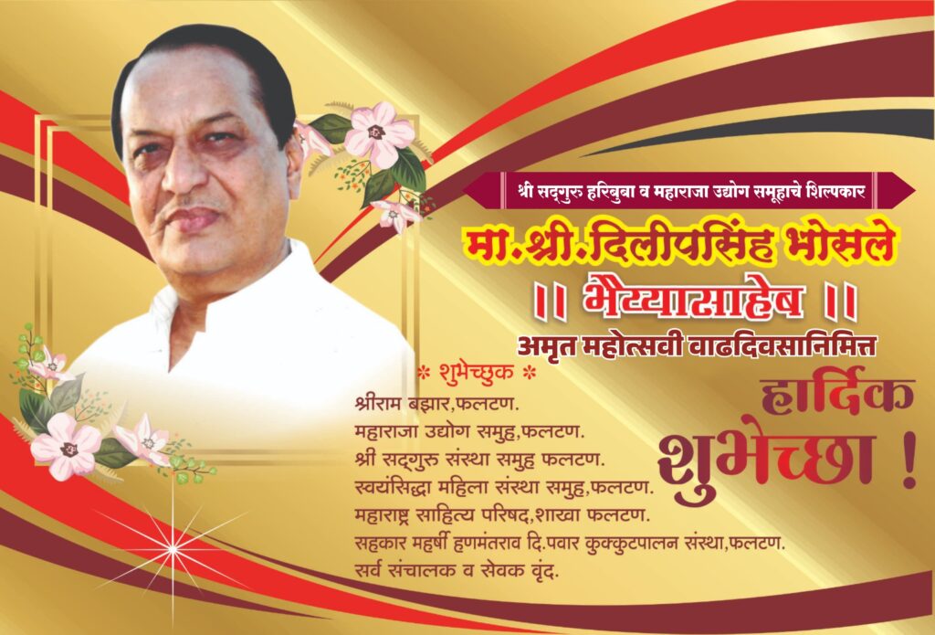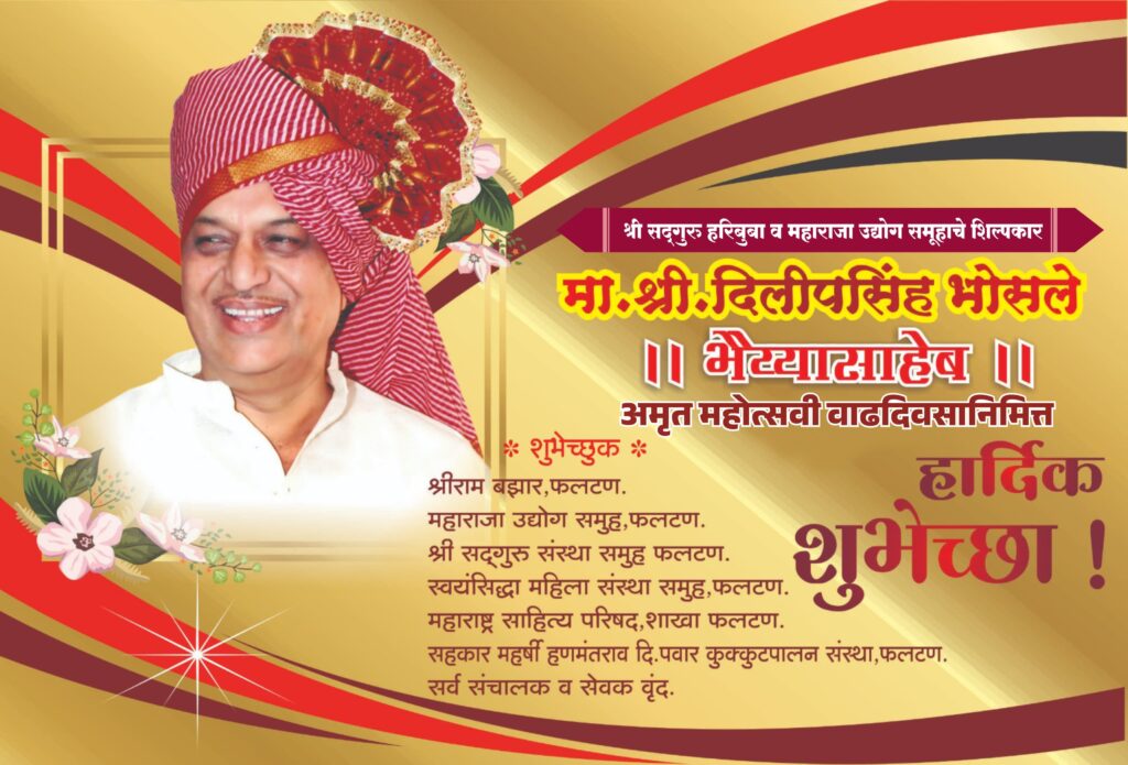 फलटण प्रतिनिधी:- श्री सदगुरू व महाराजा उद्योग समूहाचे संस्थापक अध्यक्ष दिलीपसिंह भोसले यांच्या अमृत महोत्सवी वाढदिवसानिमित्त मंगळवार दिनांक 14 ऑक्टोंबर रोजी विविध सामाजिक व सांस्कृतिक कार्यक्रमाचे आयोजन करण्यात आल्याची माहिती सत्कार समितीच्या वतीने देण्यात आली आहे.