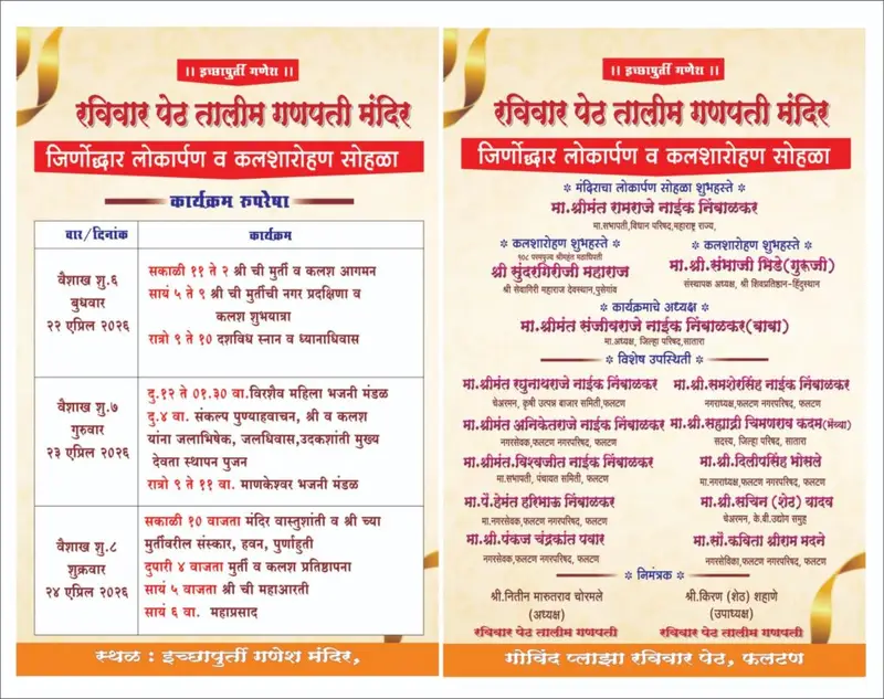 फलटण – शहरातील रविवार पेठ येथील तालीम गणपती मंदिराचा जीर्णोद्धार पूर्ण झाल्यानिमित्त लोकार्पण व कलशारोहण सोहळा मोठ्या उत्साहात साजरा करण्यात येणार असून, दि. २२ ते २४ एप्रिल दरम्यान विविध धार्मिक कार्यक्रमांचे आयोजन करण्यात आले आहे.